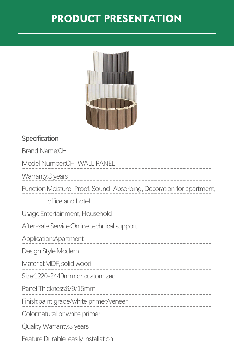 Model Number:CH-WALL PANEL Warranty:3 years Function:Moisture-Proof, Sound-Absorbing, Decoration for apartment, office and hotel Usage:Entertainment, Household After-sale Service:Onsite Installation, Online technical support Design Style:Modern Material: solid wood Quality Warranty:3 years Certificate:ISO9001 Feature:Durable, easily installation