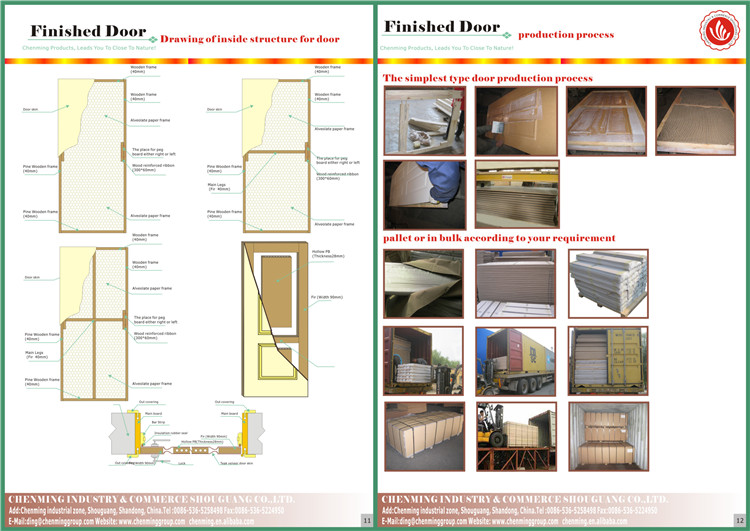4. Interior structure: Firwood keleton + honeycomb paper frame +polymerized amine grease stuffing+ 3mm HDF door skin on both side or white prime coating