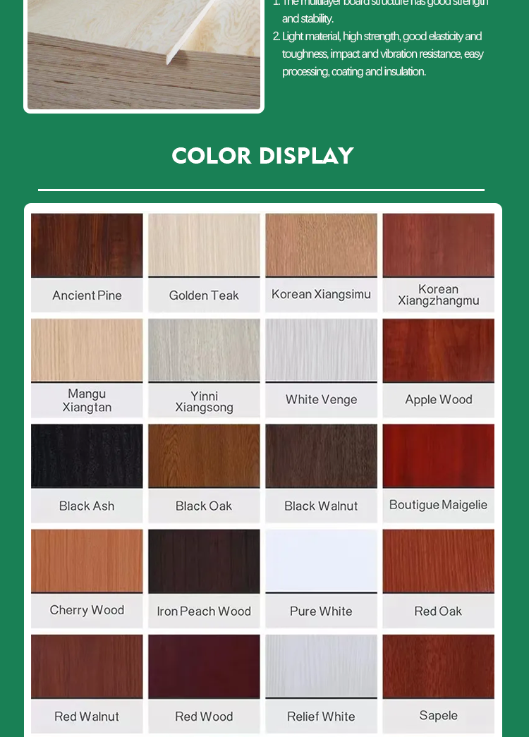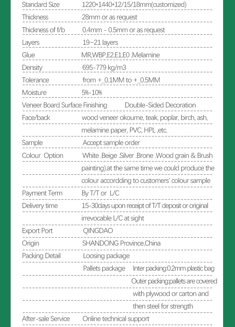 | Face/back | wood veneer okoume, teak, poplar, birch, ash etc, melamine paper, PVC, HPL and so on. |