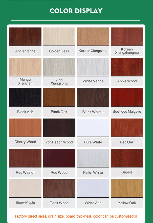 | مخ/شا | د لرګیو وینیر اوکوم، ټیک، چنار، برچ، ایش، میلامین کاغذ، PVC، HPL، او نور. | |